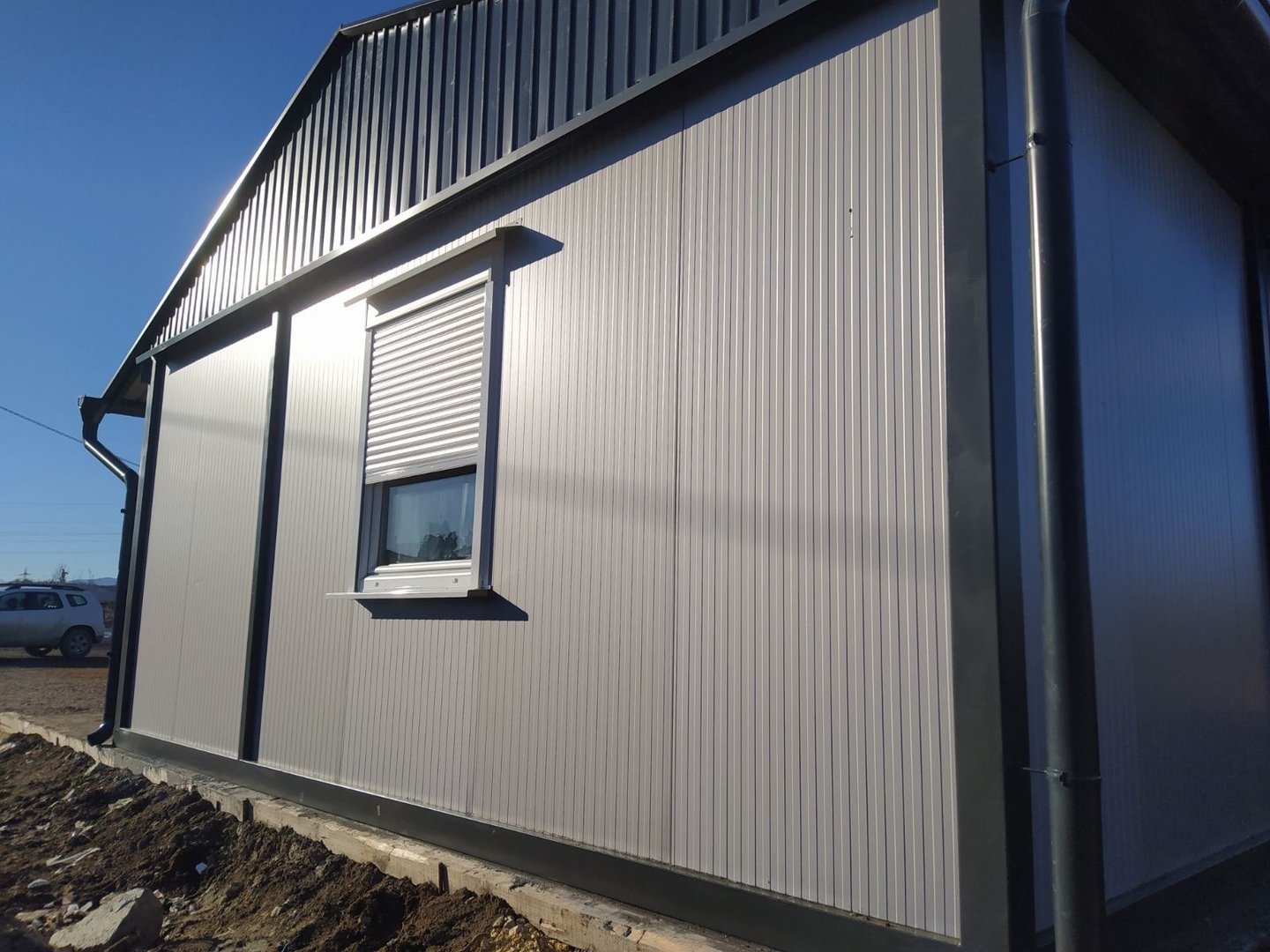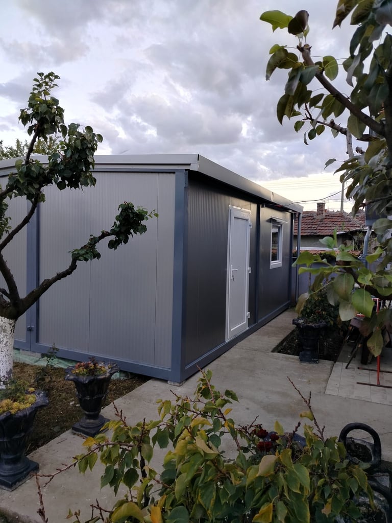 2 spojena kontejnera (4.8x6m) sa kupatilom, integrisanim krovom na dve vode i terasom sa nastrešnicom od sendvič panela (2.4x6m): 11.400€